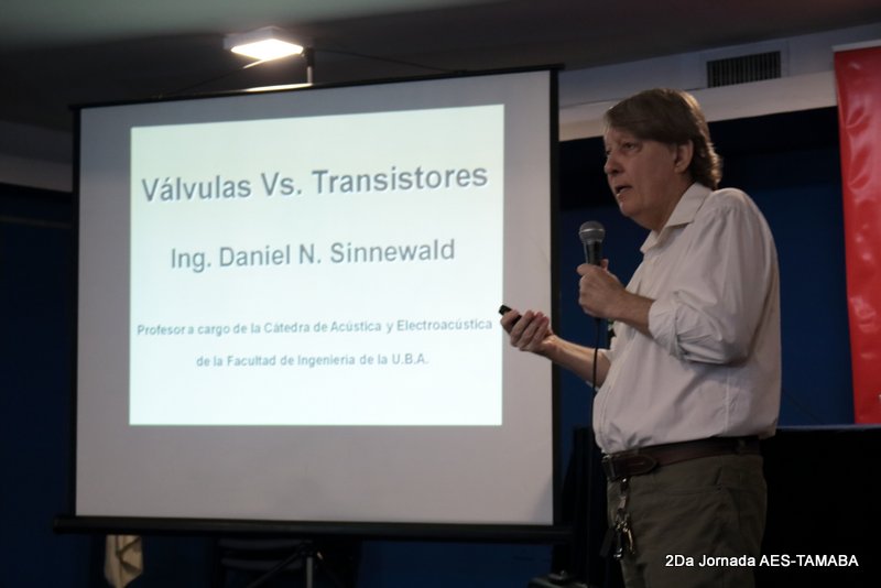 Para cerrar la Comisión de Profesionales, la última MasterClass estuvo a cargo del Ing. Daniel Sinnewald, quien presentó su trabajo de investigación “Válvulas Vs Transistores”. Por más de 80 minutos, repasó los conceptos de distorsión armónica total, distorsión por intermodulación y distorsión TIM. Abordando el funcionamiento de la amplificación realizada por una válvula y por un transistor, compartió con los presentes los resultados obtenidos de las distintas mediciones realizadas en laboratorio y “en vivo”, permitiendo la escucha de la “calidez de la distorsión valvular”.