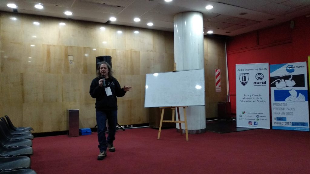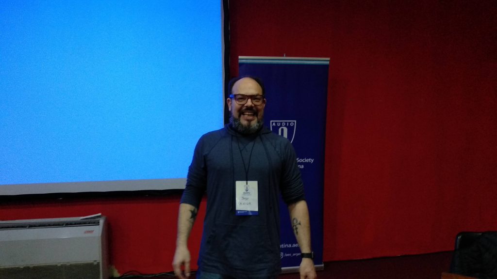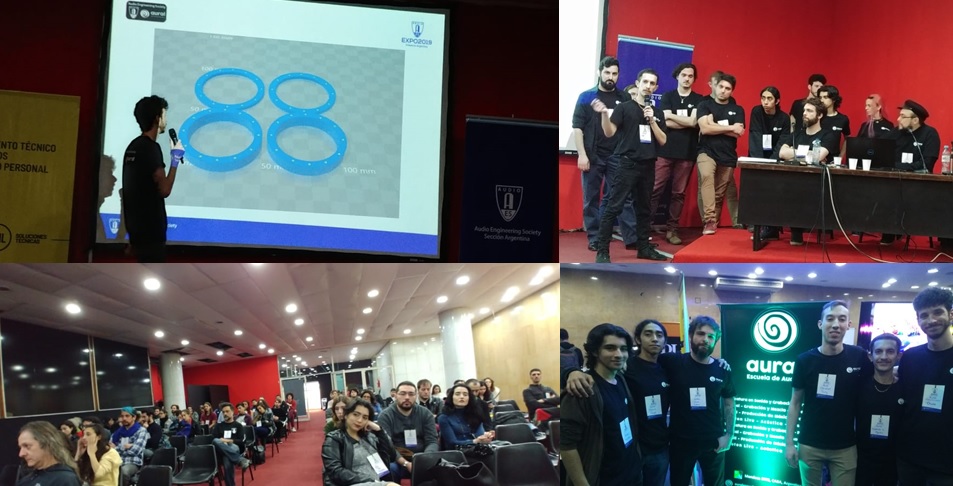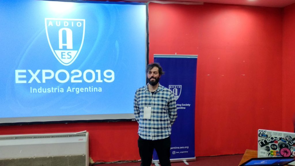 “Cuando hace un tiempo dije voy a anotarme a estudiar “grabación en estudio y producción musical” nunca me imagine estar leyendo un libro que hable de la transformada de Fourier como “Análisis espectral”, mucho menos formar parte de un laboratorio de investigación. Uno quería grabar canciones y poder ayudar al músico desde otro lado. El grupo de profesionales de Aural, no solo logro hacer que me interese en esos libros, sino de pasarla bien mientras los leía. Todavía me acuerdo cuando Leandro años atrás nos hablaba de AES, de todo el mundo que había atrás de esas 3 siglas y que podíamos formar un grupo de investigación en la escuela con el apoyo de ustedes. Mi cara de “no sé de qué me está hablando” pero la idea de un grupo de personas pasándola bien, compartiendo conocimientos, me parecía extraordinaria. Esta sección arranco allá por abril del 2018, ahí logre apreciar un grupo de personas contentas y con ansias de crecer. Fuimos aprendiendo a trabajar en equipo, leyendo, investigando y ejecutando las pruebas necesarias como por ejemplo, medir nuestra propia HRTF hasta analizar espectralmente canciones. Cada meeting salíamos con la cabeza media mareada de conocimientos pero a la vez con más ganas de seguir, pudiendo así dar nuestra primer charla en Diciembre de 2018 contando sobre lo trabajado en Aural. La experiencia fue muy buena, desde nervios a ansias por contar lo que nos había pasado y ver la recepción en los demás. Ya en este año el grupo de personas era más amplio y con las mismas ganas de trabajar, así que Leandro nos vino con la noticia de poder disertar en la expo de AES en Junio. Nervios, saber si podíamos estar a la altura, miedos, muchas cosas pasaron por mi cabeza… Yo era alguien que solo quería grabar canciones. Sin embargo nada de eso me detuvo a seguir, juntarme con los chicos, charlar, aprender y pasarla bien. Llego el día, al principio no estaba nervioso, porque todos habíamos trabajado y mostrado que éramos capaces. Aunque si cuando agarre el micrófono y ves que todos te están viendo se te llena la cabeza de preguntas otra vez, pero al observar a mis compañeros seguros, a Leandro y Federico apoyándonos desde un costado, empecé a disfrutar del momento. La experiencia fue algo increíble, ver a mis compañeros contentos, apoyándonos con un fuerte abrazo entre nosotros, que chicos nos vengan a preguntar sobre lo expuesto, algo indescriptible pero si muy placentero. Quería agradecerles a todos los chicos de AES por el apoyo y la buena onda que tuvieron para con nosotros. Ojala algún día pueda motivar a un chico de la misma manera que lo hicieron conmigo personas como Leandro o AES Argentina. No fue fácil ni digo que lo sea pero si trato de disfrutar el camino. Creo que este fue un puntapié como para seguir creciendo ya que nunca se deja de aprender. En serio muchas gracias por todo.”