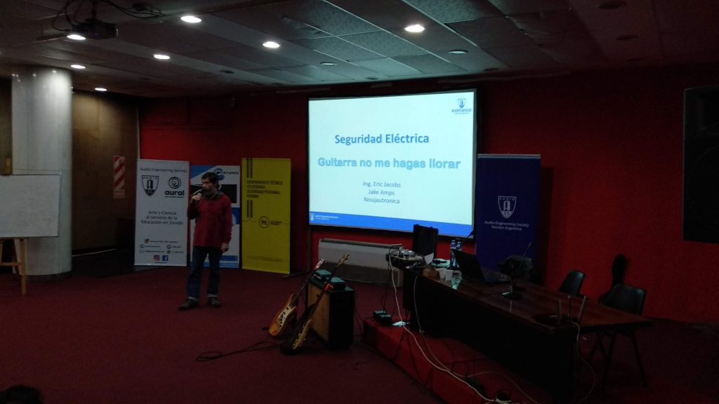 Luego de las secciones de estudiantes Eric Jacobs nos brindó un muy comprensible, ameno y necesario taller con demostraciones prácticas sobre descargas eléctricas en el equipamiento y cómo prevenirlas: Guitarra no me hagas llorar.