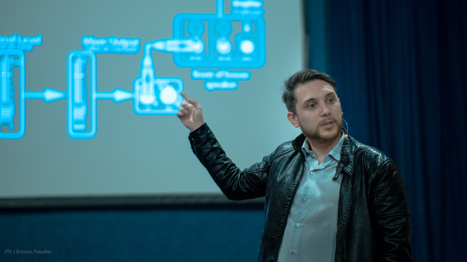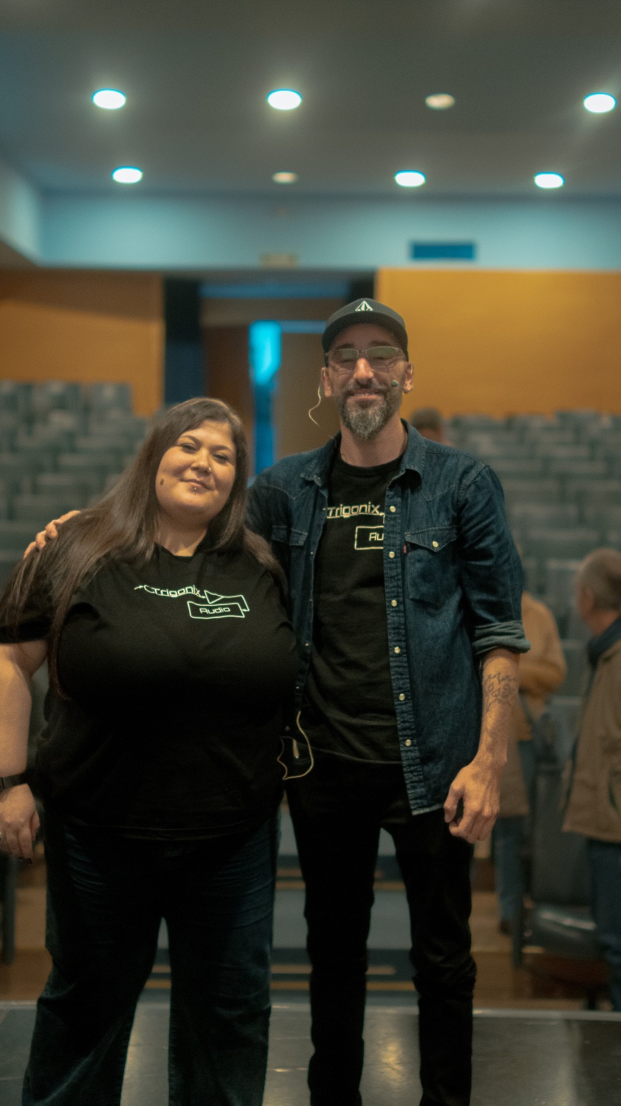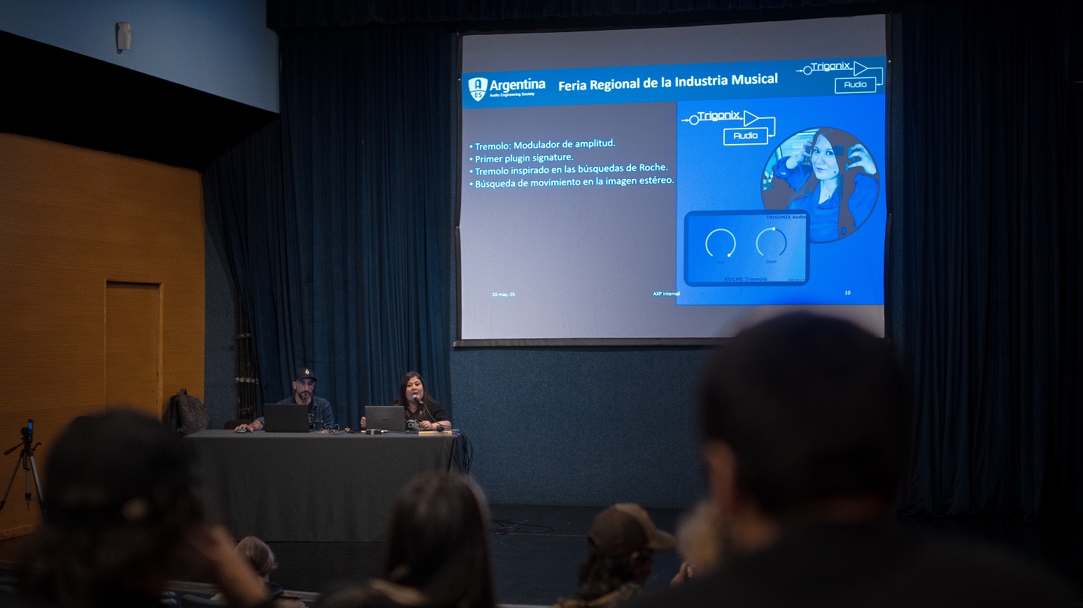 La actividad comenzó el sábado 10 en el Salón Azul, con la charla “Trigonix Audio: Desarrollando plugins de audio” a cargo de Rocío Briga y Bartolomé Serrá Muntaner. Durante 60 minutos, compartieron las fortalezas y desafíos que enfrentaron al iniciar su startup, y relataron su recorrido desde estudiantes de la Sección Estudiantil AES-TAMABA hasta fundadores de una empresa de desarrollo de plugins. Presentaron su paquete de plugins —que incluye un distorsionador, un compresor, un delay y un trémolo— e invitaron al público a descargar las versiones beta desde su sitio oficial.