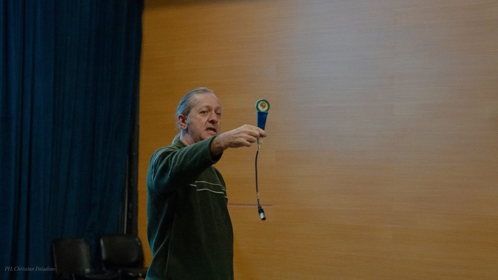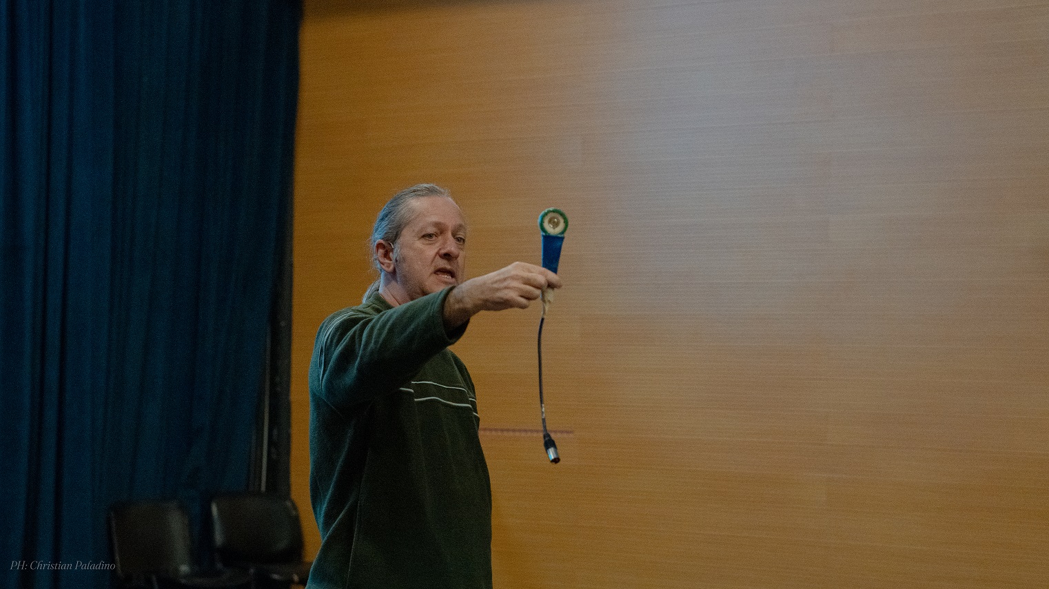 Indio Gauvron abrió la presentación compartiendo ingeniosas soluciones de ingeniería construidas con materiales caseros, mostrando ejemplos como estetoscopios, barras de madera, tuercas adaptadoras, micrófonos de bajo costo e incluso un bidón de agua adaptado como cabeza binaural. Estas herramientas le permitieron resolver desafíos profesionales en grabaciones realizadas en teatros, estudios y espacios con condiciones acústicas complejas. A continuación, Christian Paladino ilustró su exposición con fotografías de teatros, criptas, iglesias y templos donde ha realizado grabaciones, destacando cómo aplica sus conocimientos en acústica para elegir las mejores ubicaciones para micrófonos y músicos, optimizando así la calidad sonora desde el propio espacio.