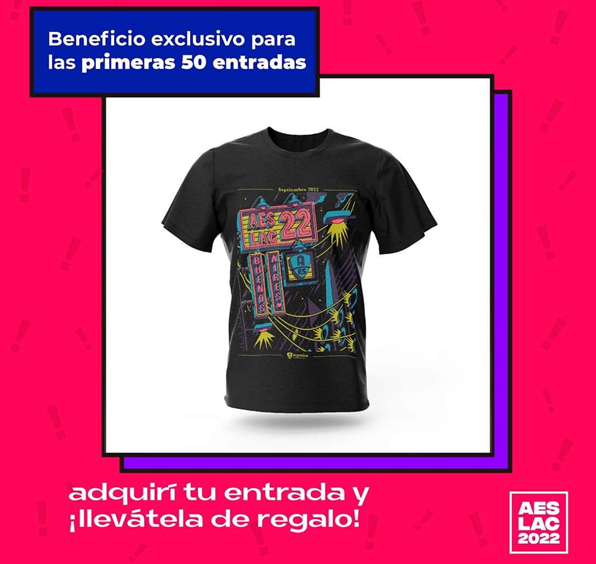 | Las primeras 50 entradas vienen con regalo Entre el 21 y el 24 de Septiembre se realizará en el NH City Hotel la Conferencia Latinoamericana de Audio. Luego de las ediciones virtuales de 2020 y 2021, la Ciudad Autónoma de Buenos Aires nos reúne para disfrutar del evento de divulgación científica vinculada al audio más importante de la región. ¡Las primeras 50 entradas vienen con remera de regalo! Para adquirirlas te invitamos a hacer click aquí. Para conocer el programa, planificar tu visita y/o conocer como llegar te comendamos visitar la web oficial www.aeslac2022.com.ar ¡Nos vemos en Septiembre! |