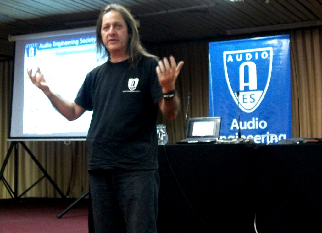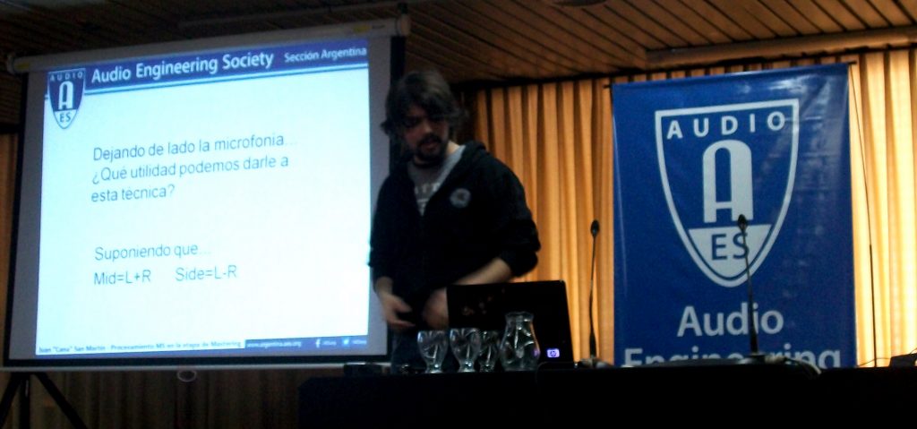 Comenzó con una descripción del desarrollo y utilización de la matriz Mid/Side, describió los procesos habitualmente empleados en la etapa de masterización de audio con especial énfasis en los que modifican la sensación de espacialidad. Entre otras cosas se discutió, con una buena participación del público presente, ventajas y desventajas de dichos procesos tanto en el dominio analógico como en el digital y se realizaron escuchas con ejemplos de los mismos en sesiones de mastering reales.