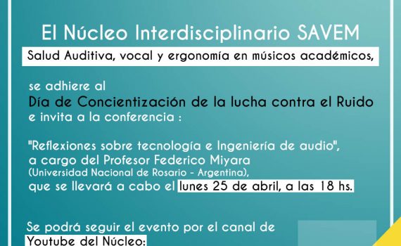 El Núcleo Interdisciplinario SAVEM – Salud Auditiva, vocal y ergonomía en músicos académicos, se adhiere al Día de Concientización de la lucha contra el Ruido e invita a la conferencia : «Reflexiones sobre tecnología e Ingeniería de audio», a cargo del Profesor Federico Miyara (Universidad Nacional de Rosario – Argentina), […]