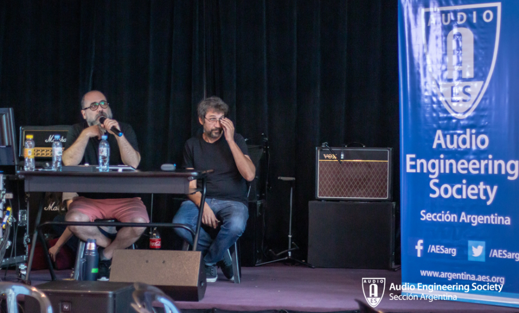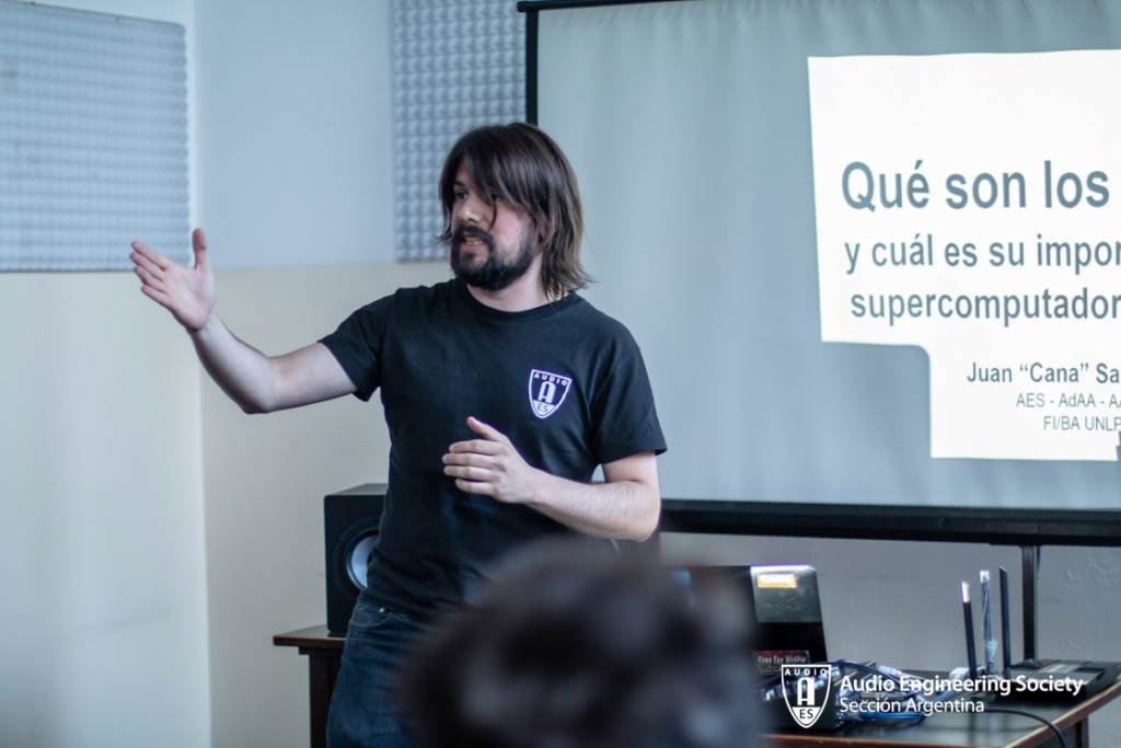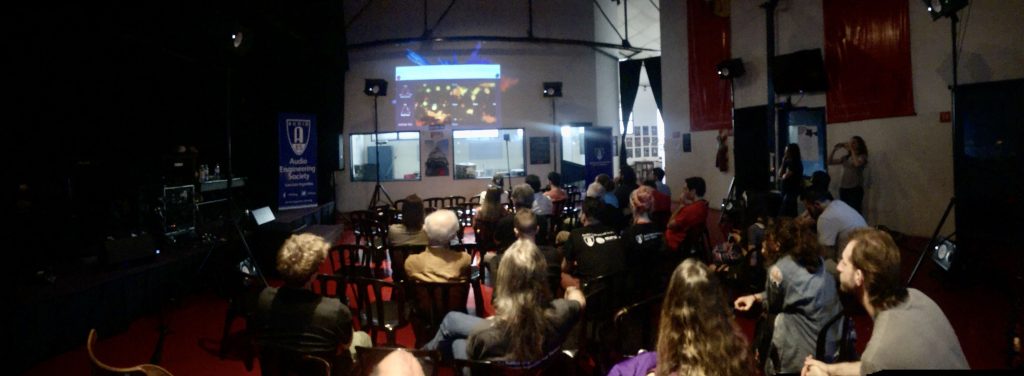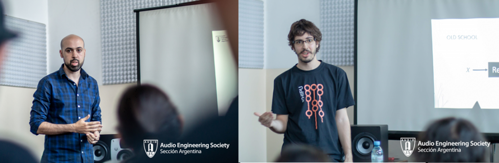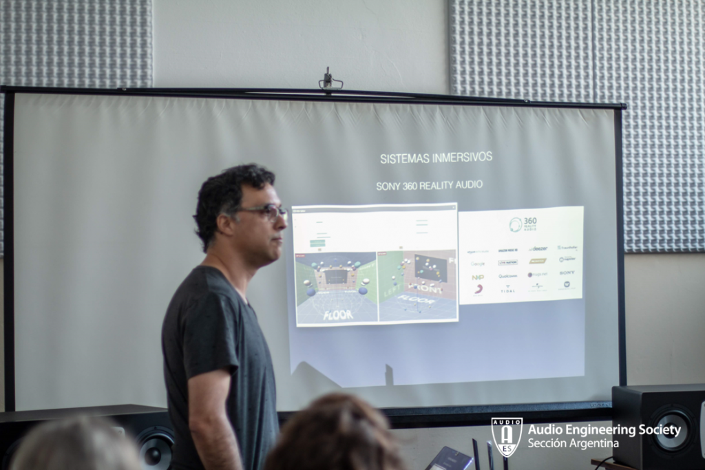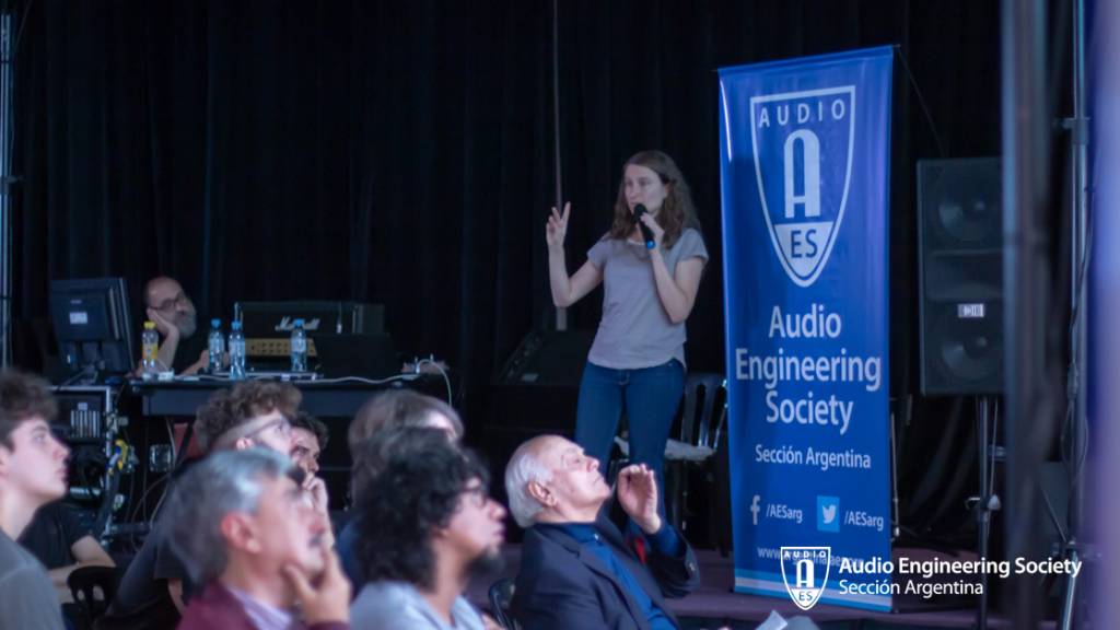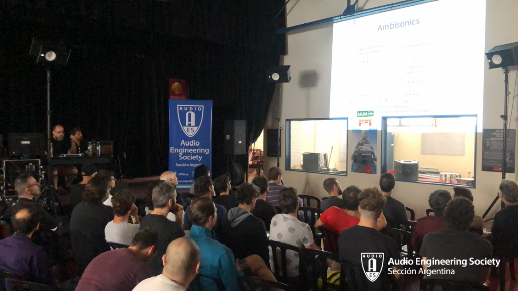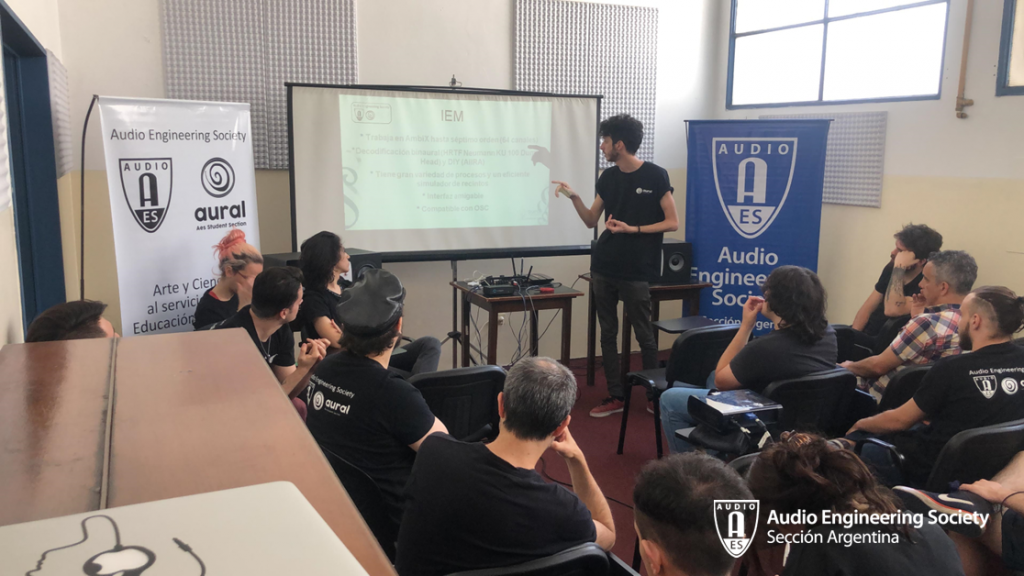 Las actividades dentro del aula 12 a lo largo de la jornada fueron las siguientes; en primer lugar, por la mañana, la muy activa Sección Estudiantil AES-Aural presentó sus trabajos de investigación: “Ambisonics: Introducción y estrategias de realización con monitoreo binaural”. Carla Gatica, Diego Flores, David Joya Galindo, Julián Ochat, Maximiliano Osuna y Leandro Rodríguez (Faculty Advisor de la sección), comentaron de forma sintética los trabajos de este grupo en la investigación sobre Ambisonics: como dentro un DAW se puede mezclar en 3D con auriculares en tu casa.