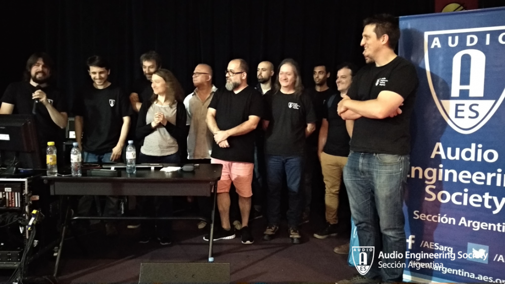 Finalmente, como cierre de la Sección Estudiantil AES-Aural, Federico Lorenzo Martín, Ignacio Speranza, Christian Tritz, Gonzalo Montiel y Nicolás Fernández, presentaron: “Confusión atrás adelante en la percepción binaural”. Compartieron los pormenores de un experimento perceptual al respecto, haciendo en primer lugar las introducciones teóricas necesarias del caso y luego contando como registraron respuestas impulso binaurales en un sistema octofónico en AURAL, como así también sobre su visita a ECOS Escuela de Sonido para hacer uso de su cámara semi-anecoica y así comenzar con el trabajo en conjunto entre secciones AES estudiantes de Argentina.