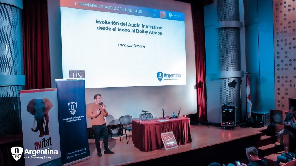 Después de un receso para el café, el tercer turno fue dirigido por el ingeniero de sonido Francisco Bissone, quien, antes de su participación en la próxima Conferencia de Audio Latinoamérica AES LAC QUITO 2023, contribuyó a la Jornada AES-UNLA con su charla «Evolución del Audio Inmersivo: desde el mono al Dolby Atmos».