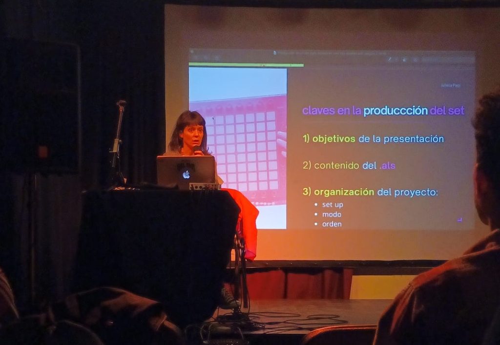 Finalmente, Julieta Papi cerró la jornada con la presentación “Producción de un set para música en vivo con Ableton”. A través de distintos ejemplos y proyectos en Ableton Live, la disertante analizó la organización general de un show solista o con banda, el uso de controladores MIDI, automatizaciones, ruteos de audio y la utilización de clips y efectos dentro del entorno digital.
