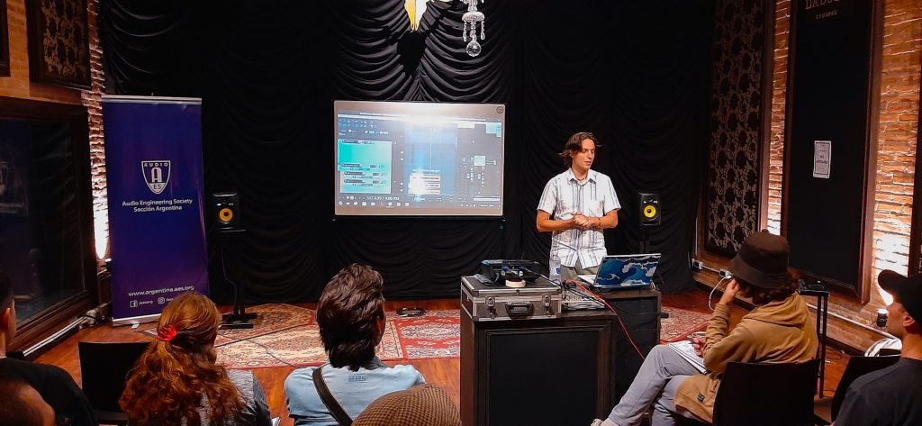 La última charla estuvo a cargo de Ezequiel Morfi, quien compartió técnicas, usos y aplicaciones de las herramientas más utilizadas en la masterización de música en estéreo. Profundizó en las cadenas de procesadores (plugins) gratuitos para lograr los resultados que escuchamos hoy en las plataformas de streaming, y realizó una masterización en vivo.