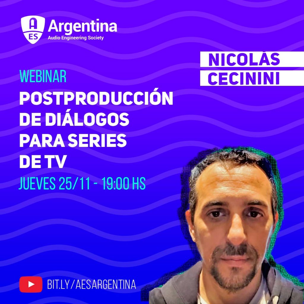 El próximo jueves 25/11 daremos lugar a nuestro décimocuarto webinar, en esta oportunidad contaremos con la gran experiencia de Nicolás Cicinini, quien nos hablará acerca de la postproducción de diálogos para series de televisión. No te pierdas la charla de Nicolás que cuenta en su haber con una amplia experiencia en la industria audiovisual como diseñador, mezclador, y editor de sonido!