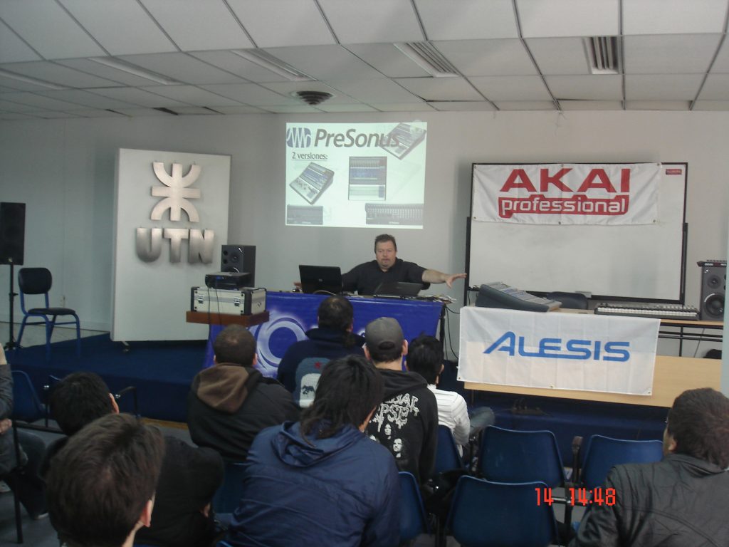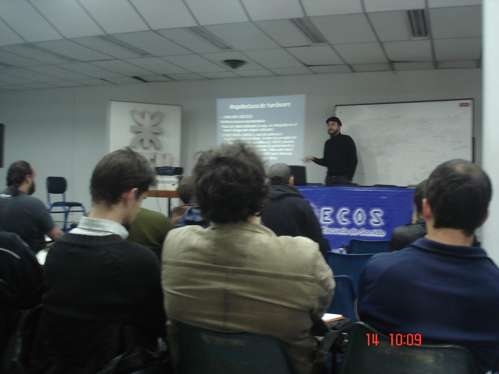 En la primera charla, Leandro Rodriguez, docente de la escuela, repasó con una perspectiva técnica el hardware crítico y no crítico y su relación con el software en las plataformas Mac y PC, desde el punto de vista de rendimiento, ancho de banda, periféricos, y demás, para el uso de multipistas e instrumentos virtuales, entre otros.