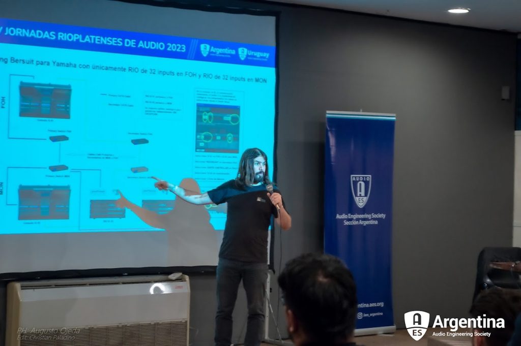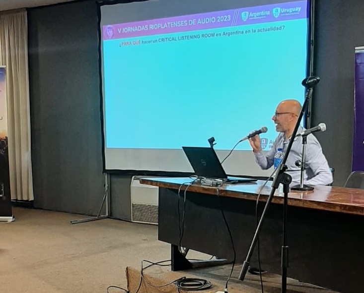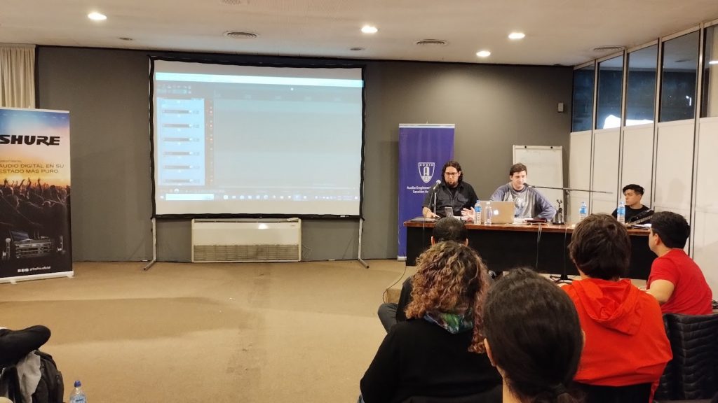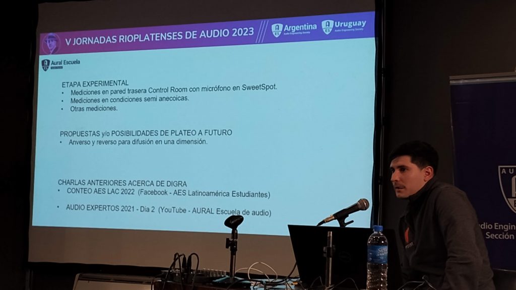 Mientras que luego del almuerzo, hizo lo propio el estudiante Sebastián Lamela de AES-AURAL y realizó la presentación de su Work in Progress “Proyecto CLR” que consta de la realización de una sala diseñada y tratada acústicamente para minimizar las interferencias y distorsiones sonoras que pueden afectar la experiencia auditiva.